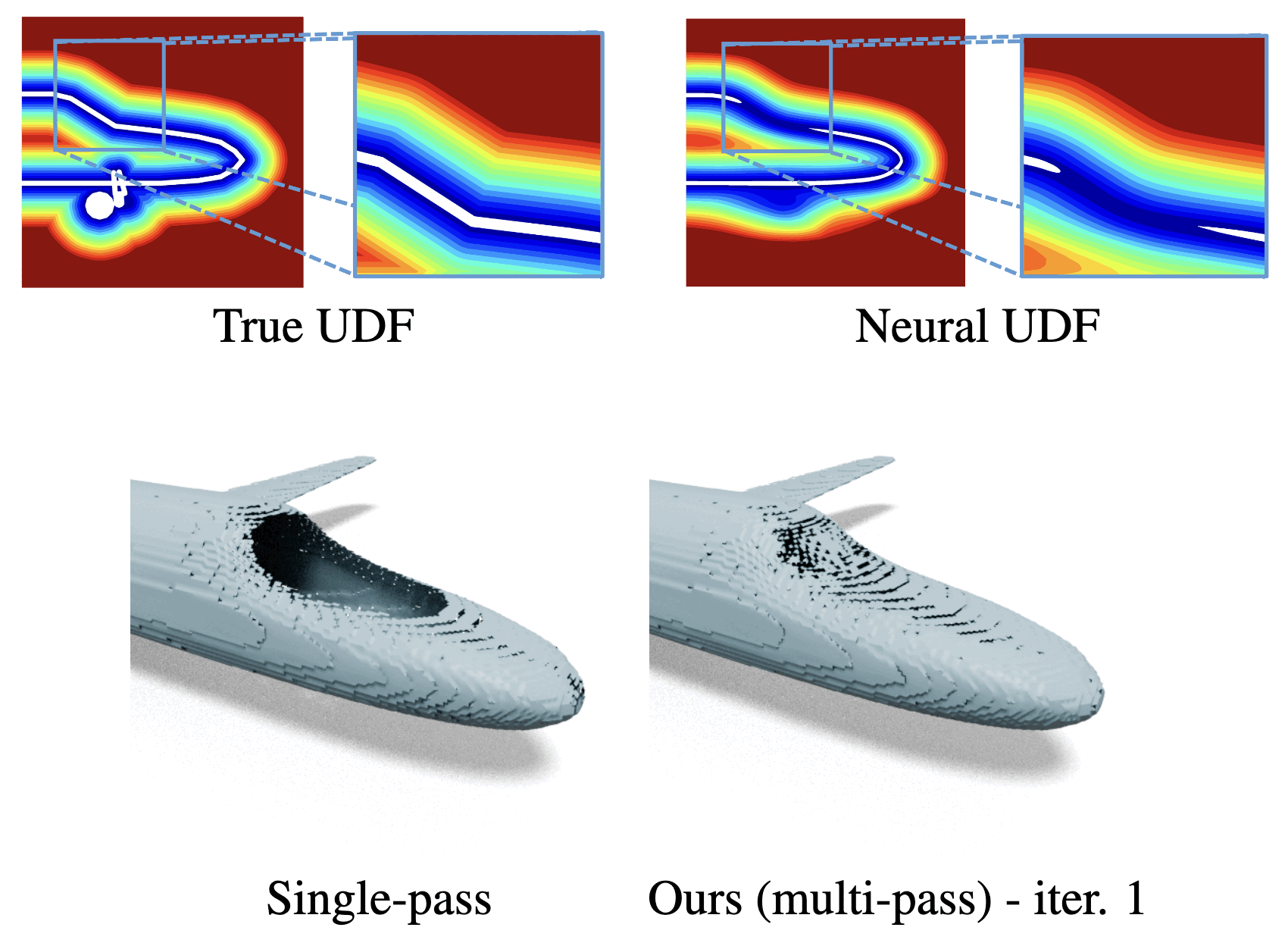 Meshing neural UDFs at high resolution poses intrinsic challenges, with many algorithms missing entire surface portions. But what if we let an algorithm run multiple times, refining its predictions iteratively?