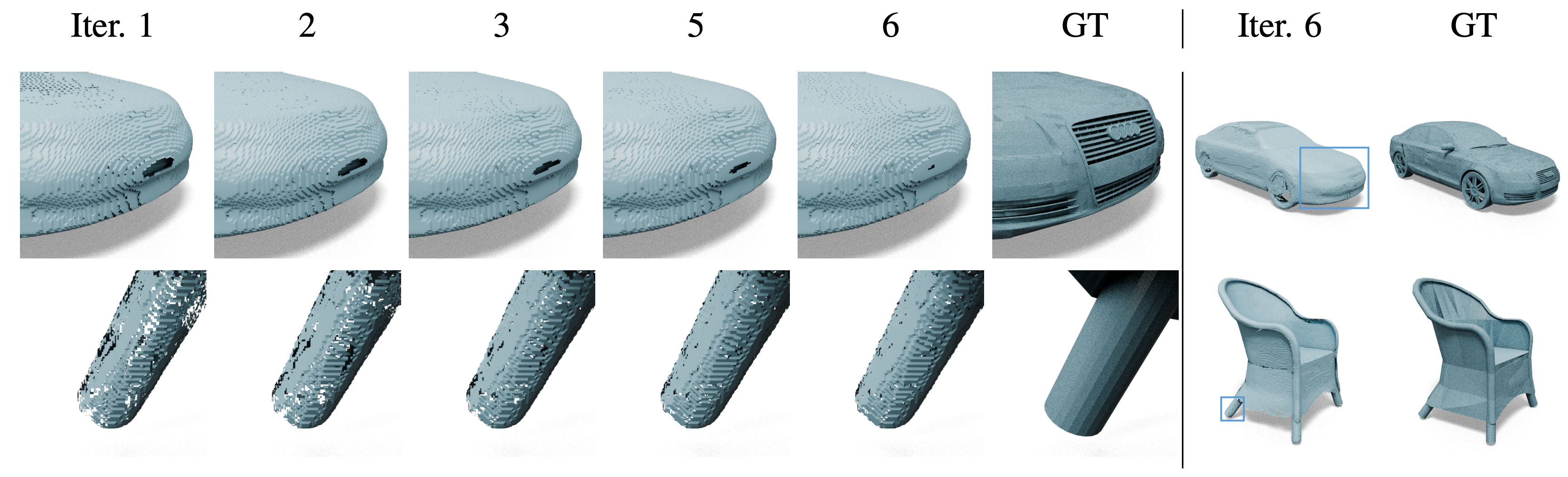 We formulate high-resolution meshing as an iterative process: each iteration takes the previous output state as input and refines it.