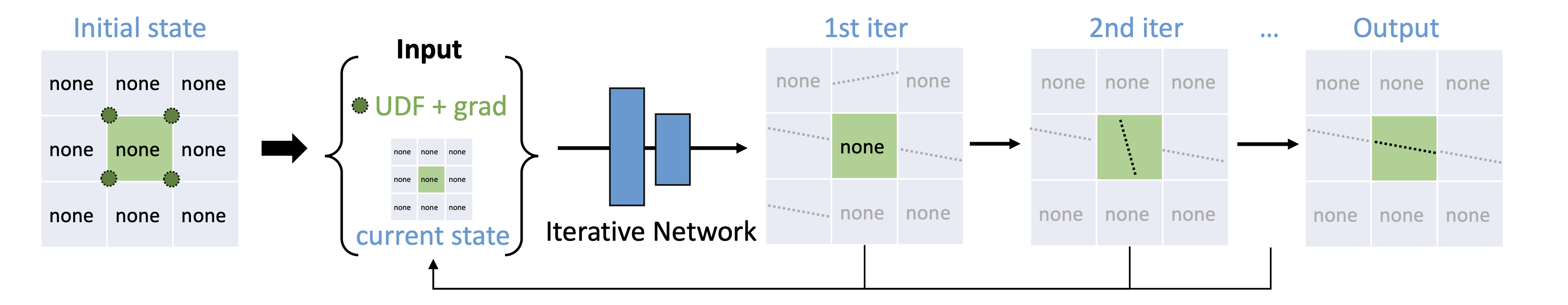 Unsigned Distance Fields (UDFs) are a natural implicit representation for open surfaces but, unlike Signed Distance Fields (SDFs), are challenging to triangulate into explicit meshes. This is especially true at high resolutions where neural UDFs exhibit higher noise levels, which makes it hard to capture fine details. Most current techniques perform within single voxels without reference to their neighborhood, resulting in missing surface and holes where the UDF is ambiguous or noisy. We show that this can be remedied by performing several passes and by reasoning on previously extracted surface elements to incorporate neighborhood information. Our key contribution is an iterative neural network that does this and progressively improves surface recovery within each voxel by spatially propagating information from increasingly distant neighbors. Unlike single-pass methods, our approach integrates newly detected surfaces, distance values, and gradients across multiple iterations, effectively correcting errors and stabilizing extraction in challenging regions. Experiments on diverse 3D models demonstrate that our method produces significantly more accurate and complete meshes than existing approaches, particularly for complex geometries, enabling UDF surface extraction at higher resolutions where traditional methods fail.The problem