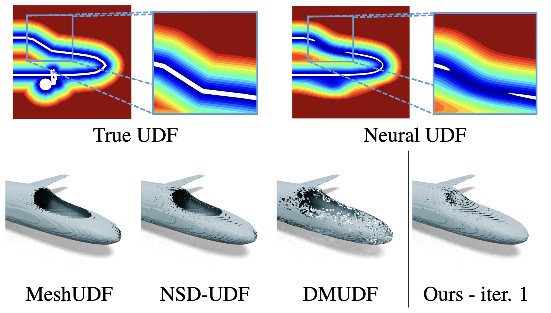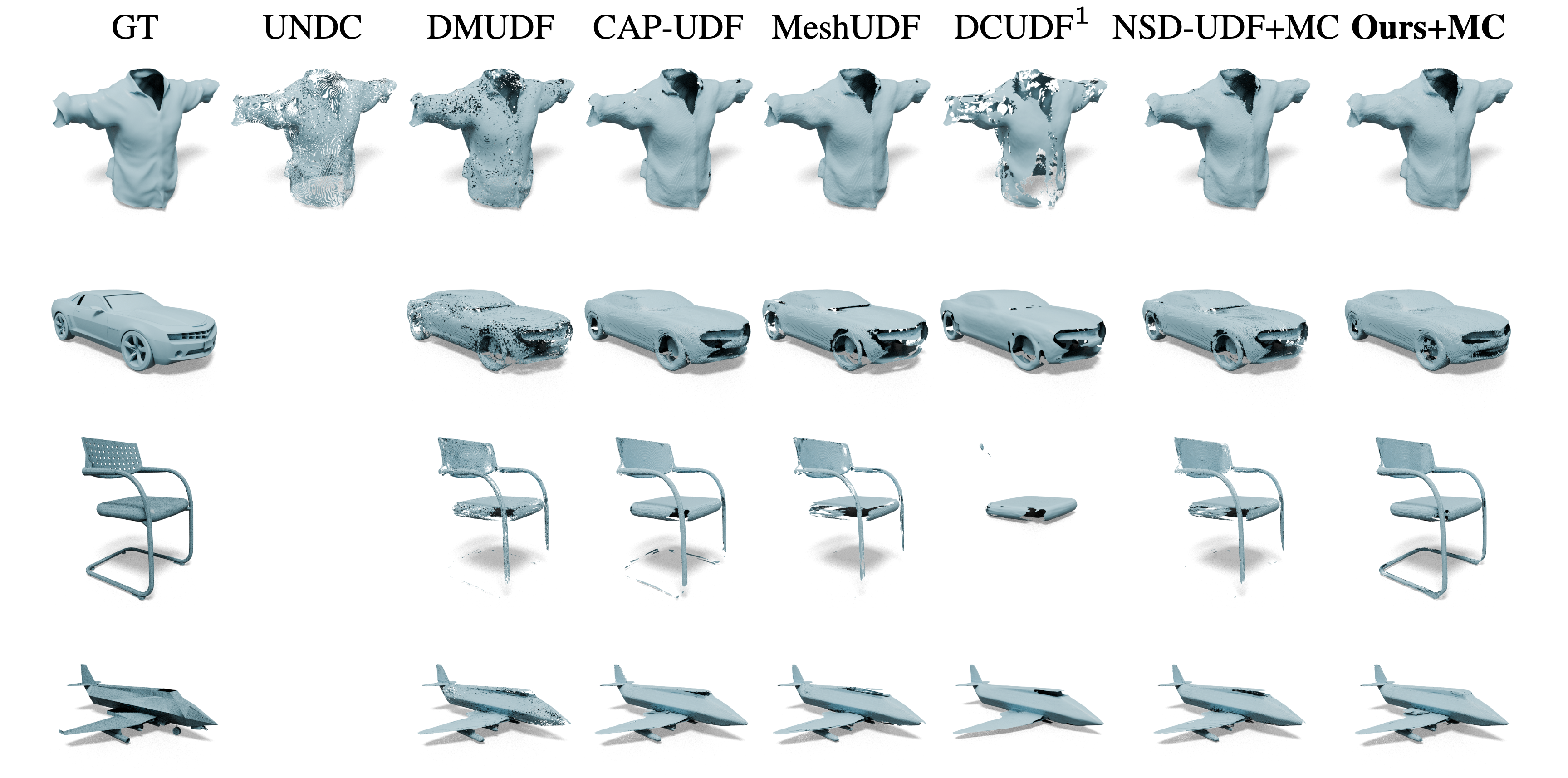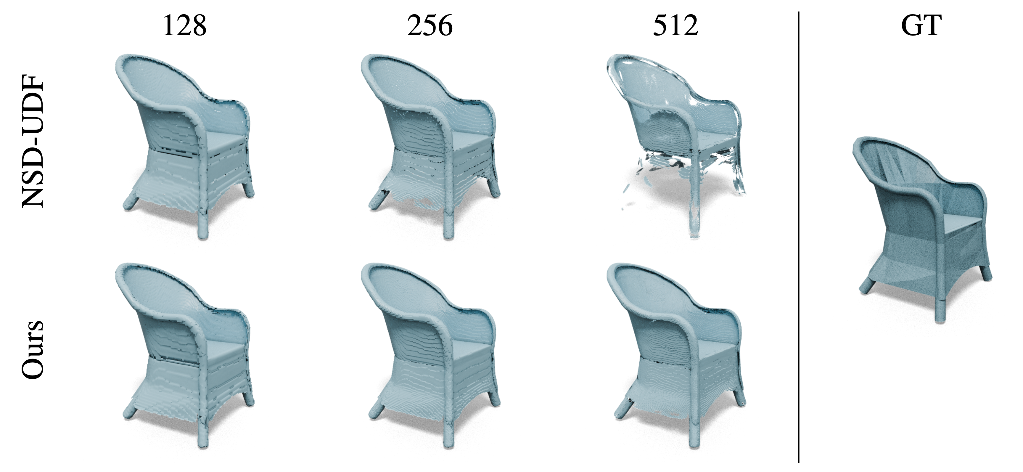 Neural UDFs are noisy and difficult to mesh. Counterintuitively, meshing at higher resolutions worsens the problem, with existing methods often missing entire portions of the surface.